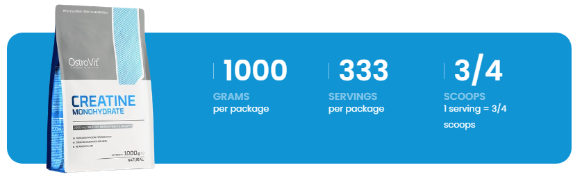 Neto teža: 300g ali 500g ali 1000g. Hranilna vrednost na odmerek 2,5 g: Kreatin monohidrat 2500 mg od tega kreatin: 2200 mg. Sestavine: Kreatin Monohidrat. Uporaba: Dodajte 2,5 g (1/2 merice) v 100 - 150 ml vode ali soka. Na dan treninga popijte dva odmerka na dan, enega takoj po tem, ko se zbudite, drugega po treningu. V dneh brez vadbe popijte eno porcijo na dan po tem, ko se zbudite. Opozorilo: Ni nadomestilo za uravnoteženo in raznovrstno prehrano. Priporočene dnevne količine se ne sme prekoračiti. Izdelek hranite izven dosega otrok. Izdelek po uporabi zaprite in hranite v suhem in hladnem prostoru. Proizvajalec: Ostrovit - Fitness Trading, Al.Wojska Polskiego 71, 18-300 Zambrow - Polska. Distributer: Herkul, trgovina s športno prehrano, Jure Potočnik s.p. Ulica Kneza Koclja 11, 2000 Maribor. Rok Uporabe: Uporabno najmajn do konca datuma odtisnjenega na original embalaži.