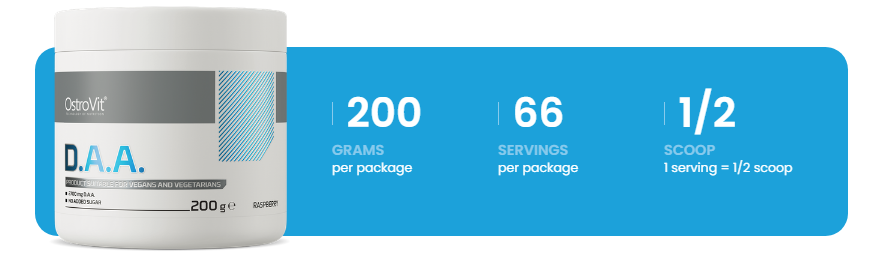 DAA je popolnoma varen izdelek, ki podpira presnovne procese in proizvodnjo testosterona. Uživanje je priporočljivo za vse osebe, ki jim je intenzivni način življenja znižal raven testosterona. DAA deluje na več ravneh hkrati - optimizira hormonsko ravnovesje pri moških in pomaga povečati libido. Je izdelek, pri katerem se že po kratkem obdobju uporabe pozna učinek (moč in napetost mišic).